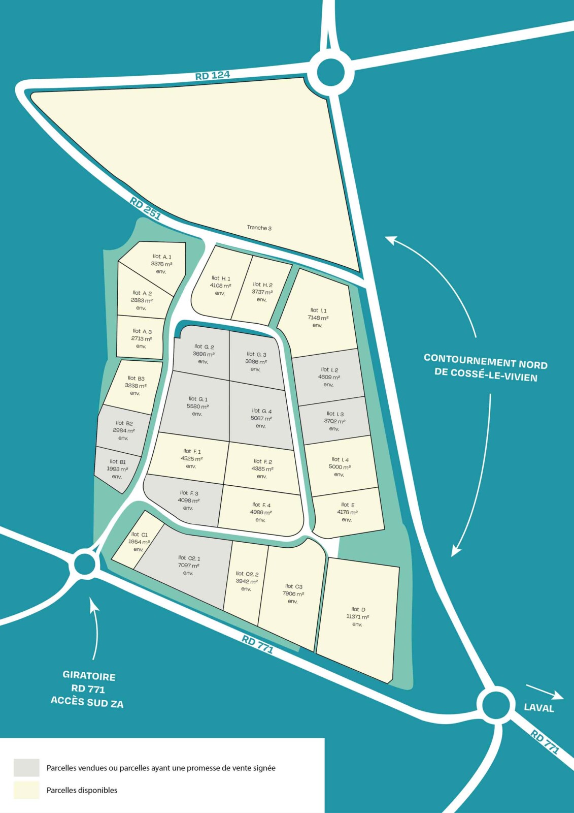 Pour connaître les terrains disponibles, consultez la carte ci-dessous.