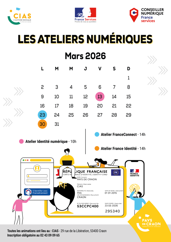 Tous les ateliers ont lieu au Centre Intercommunal d’Action Sociale, 29 rue de la Libération à Craon. Inscription au 02 43 09 09 65.